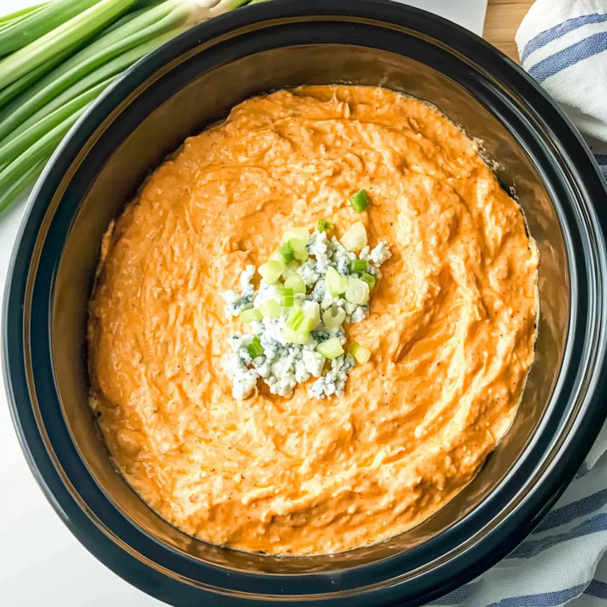 Once your Crockpot Buffalo Chicken Dip is fully cooked, remove the lid and top it with crumbled blue cheese and sliced scallions, if using. These flavorful garnishes add an appealing touch to your dish. Serve the dip warm with your favorite dippers, and watch it disappear in no time!