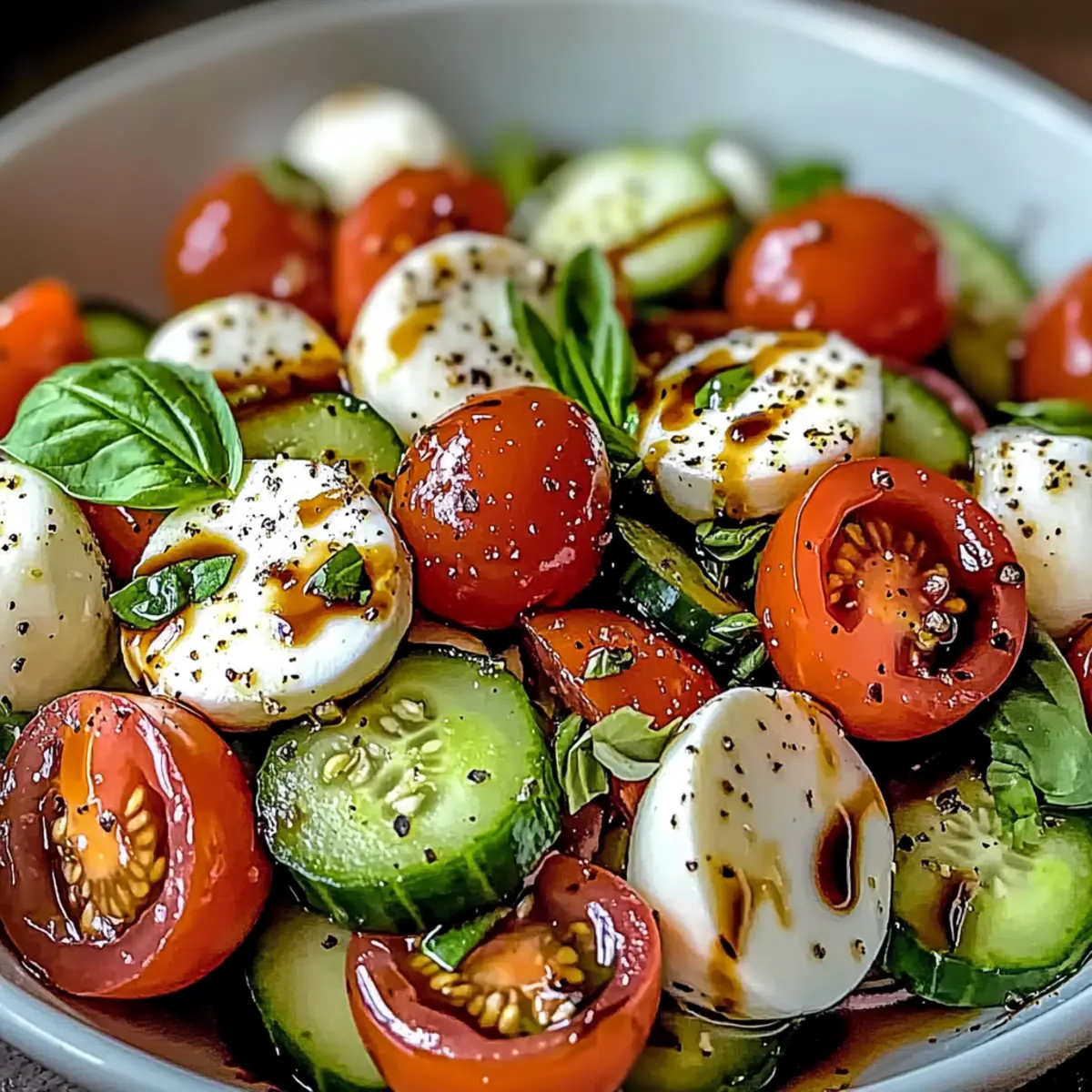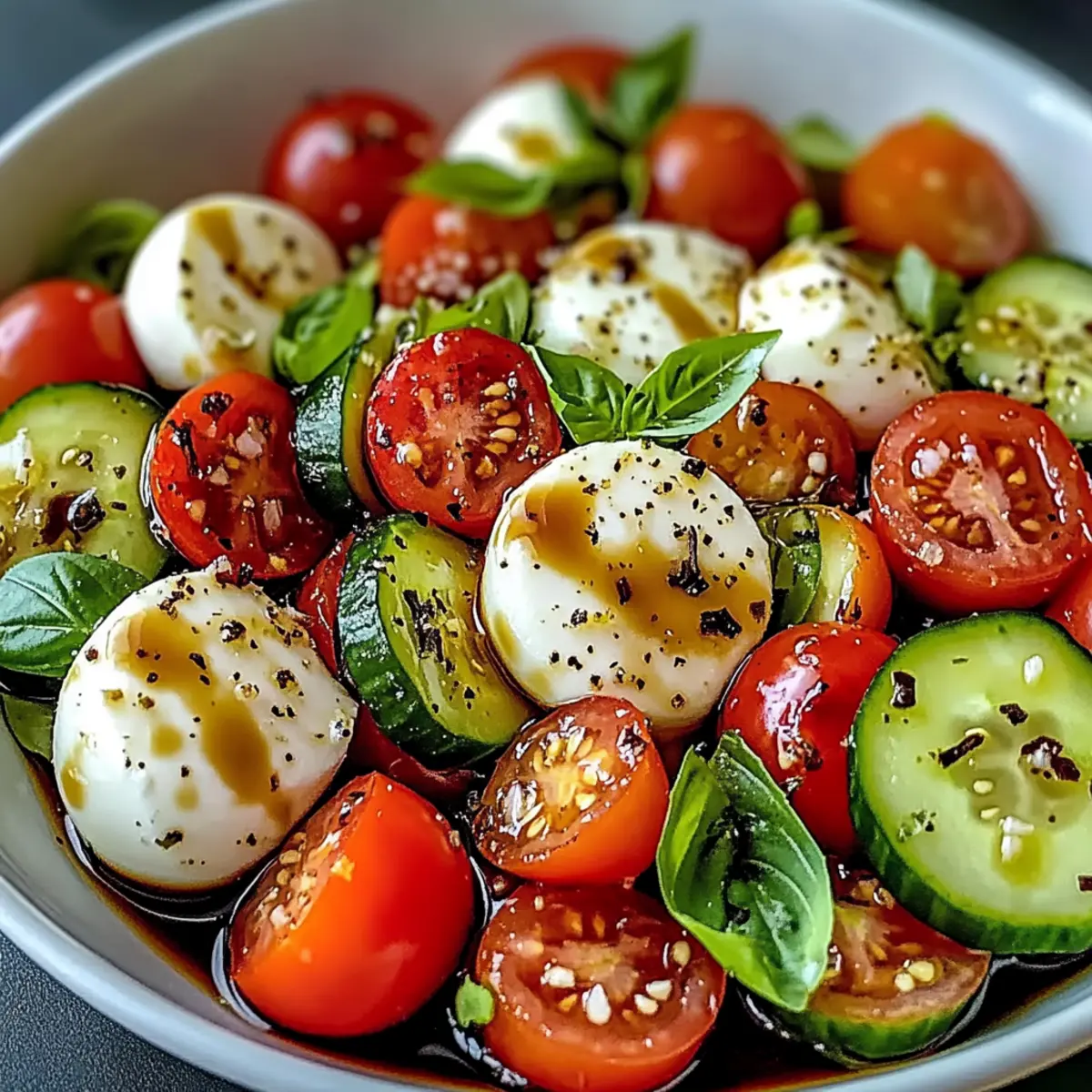 Refreshing Twist: The crisp cucumbers and sweet tomatoes create a delightful contrast to the classic Caprese flavors.