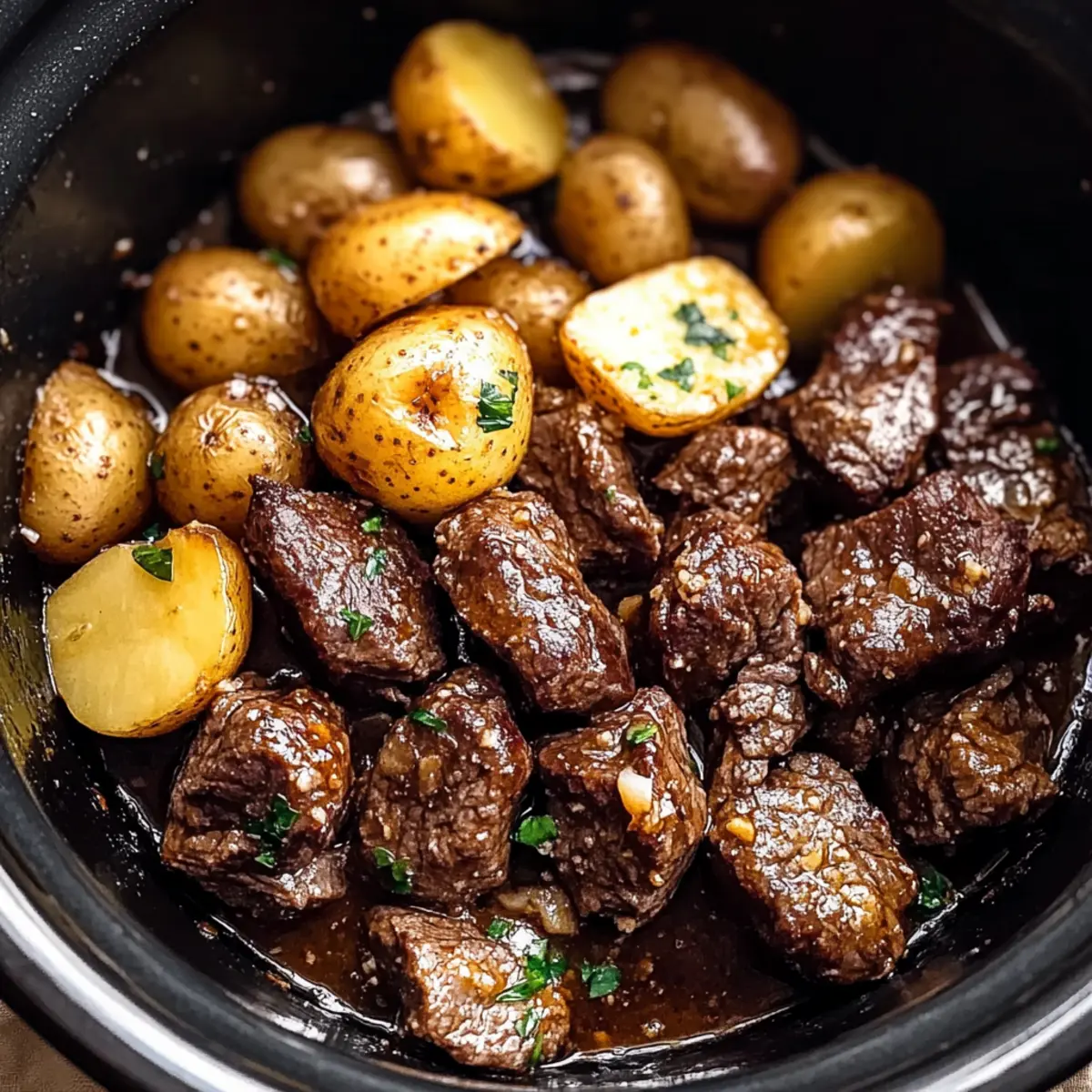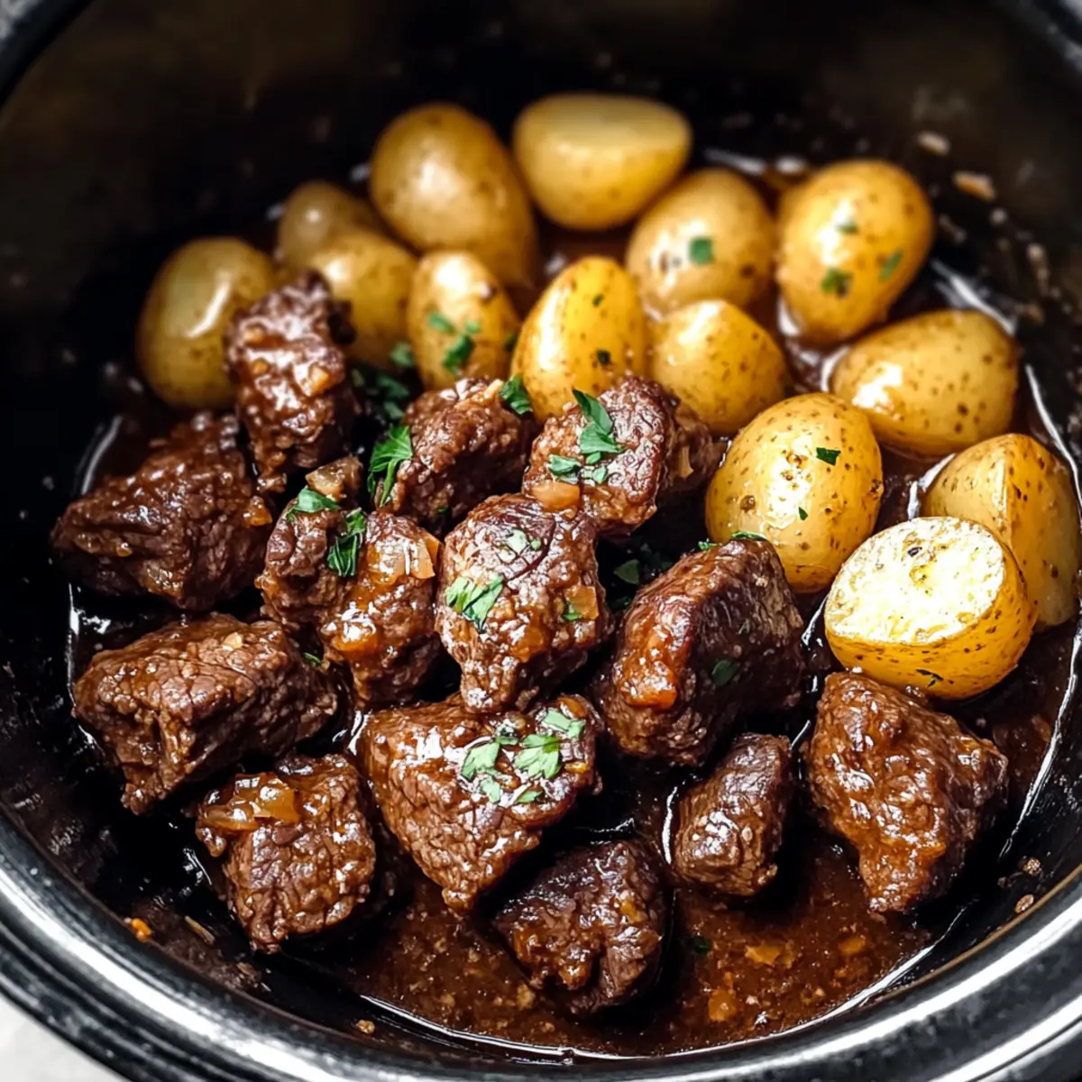 - Transfer the garlic sauce mixture over the seared beef in the slow cooker. Add the halved baby potatoes, gently tossing everything together to ensure the beef and potatoes are well-coated.