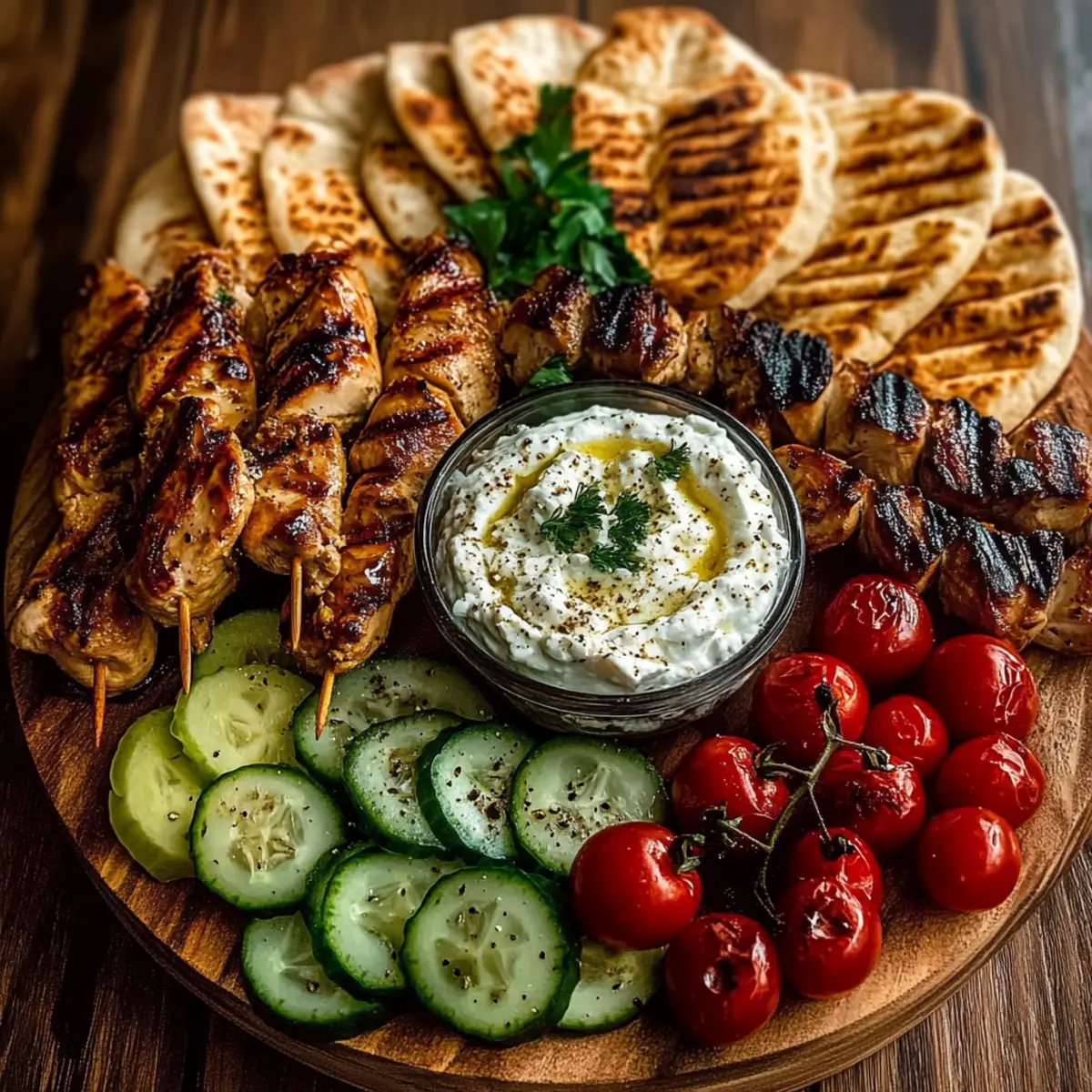 Finish your beautiful grazing board with fresh herbs like parsley, mint, or dill sprinkled over the surface for a burst of color and flavor. Encourage guests to customize their plates with the chicken, dip, and assorted vegetables. Your Greek Chicken Souvlaki Grazing Board is ready to dazzle your guests and make mealtime an interactive experience filled with fresh Mediterranean flavors.