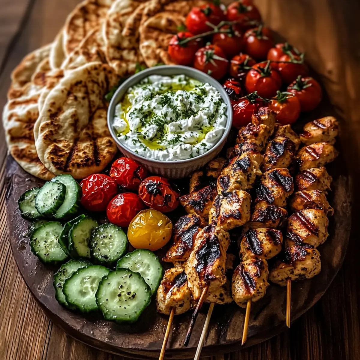 Once the chicken skewers are grilled to perfection, it’s time to get creative with your presentation. On a large serving board, arrange the grilled chicken skewers alongside bowls of feta dip, cherry tomatoes, sliced cucumbers, Kalamata olives, and roasted red peppers. Don’t forget to warm your pita bread to serve as the perfect dipping option for this colorful Greek Chicken Souvlaki Grazing Board.