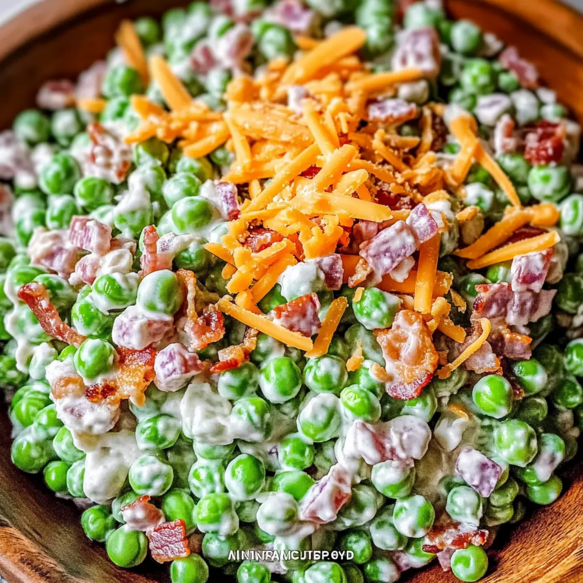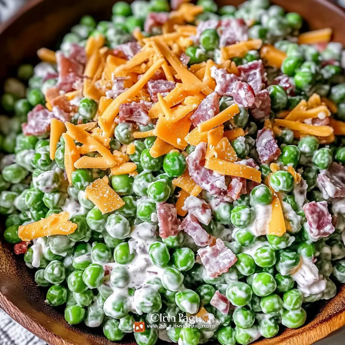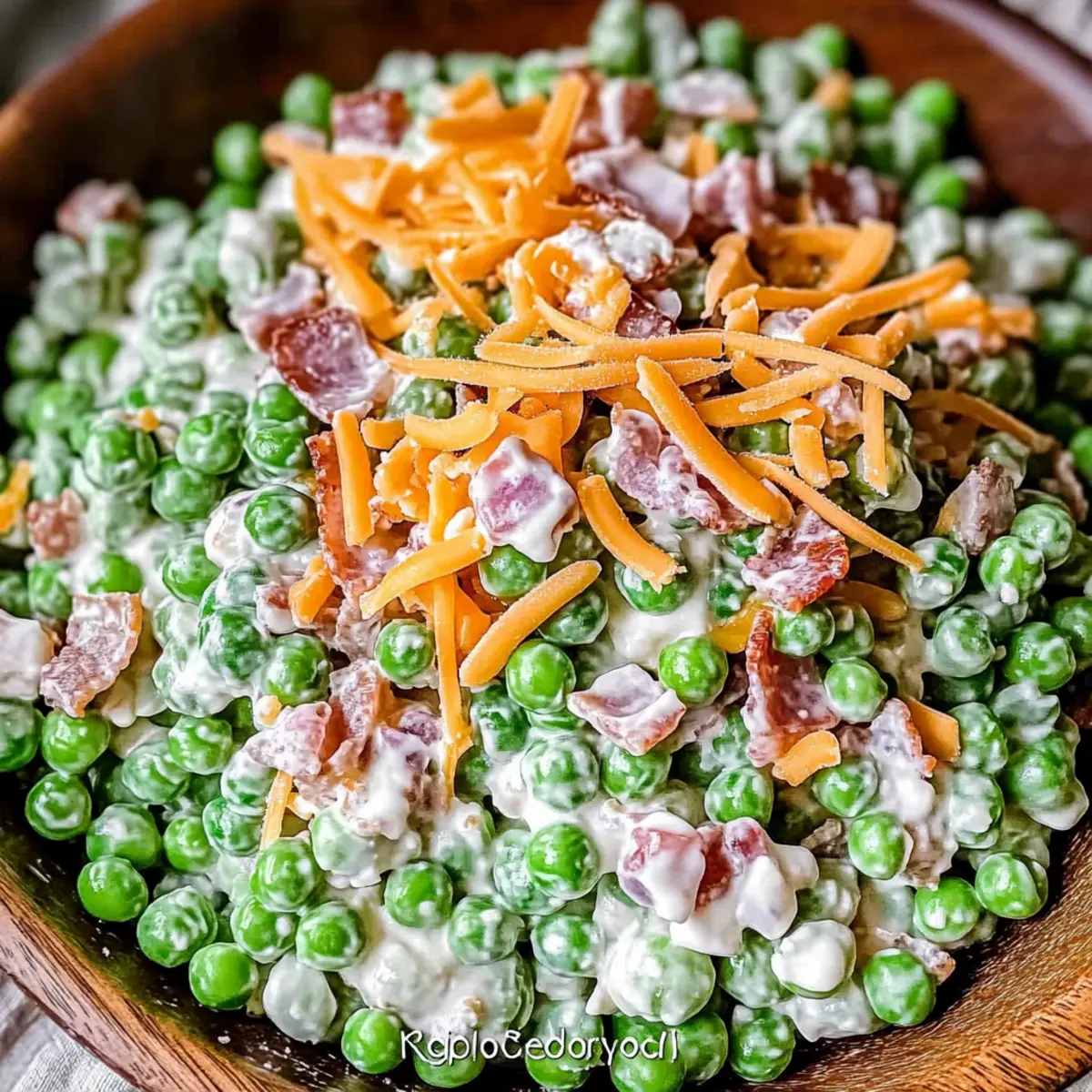 Creamy Deliciousness: Combining sweet peas, savory bacon, and sharp cheddar, this salad is a flavor explosion that tantalizes your taste buds.