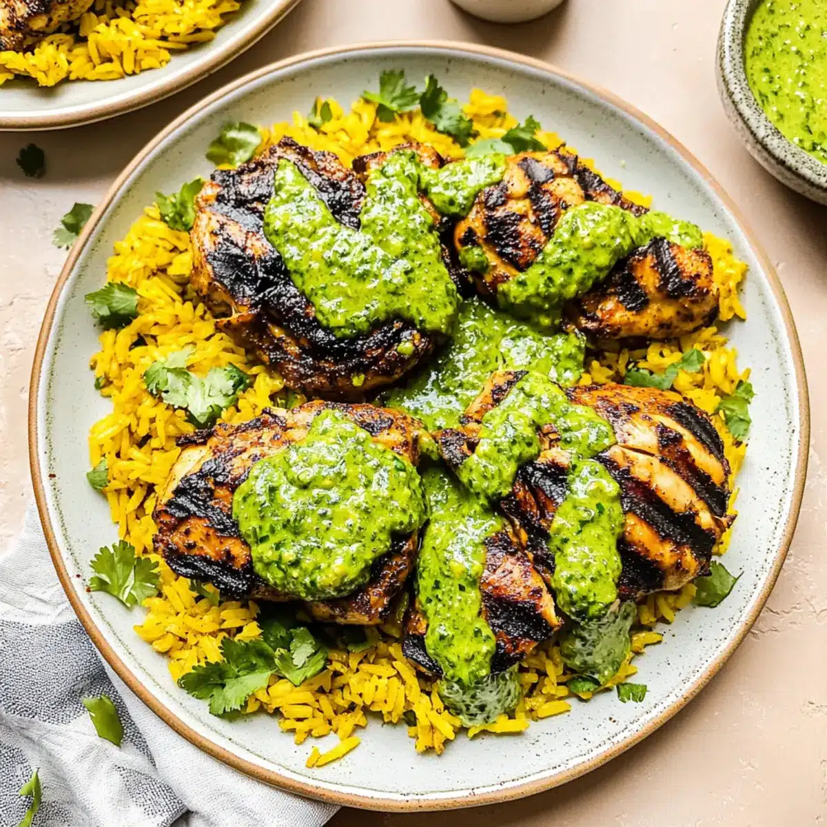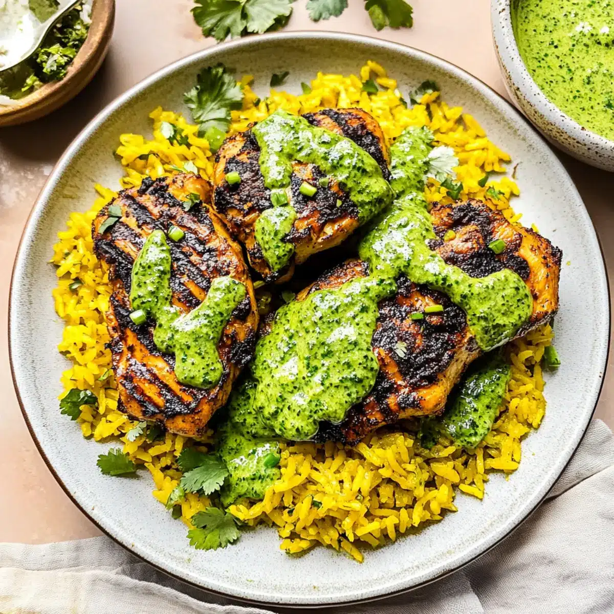 - To serve, scoop rice onto plates, top with grilled chicken, and drizzle with green sauce.