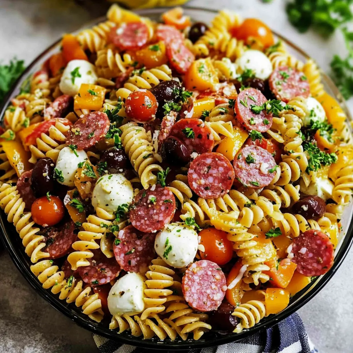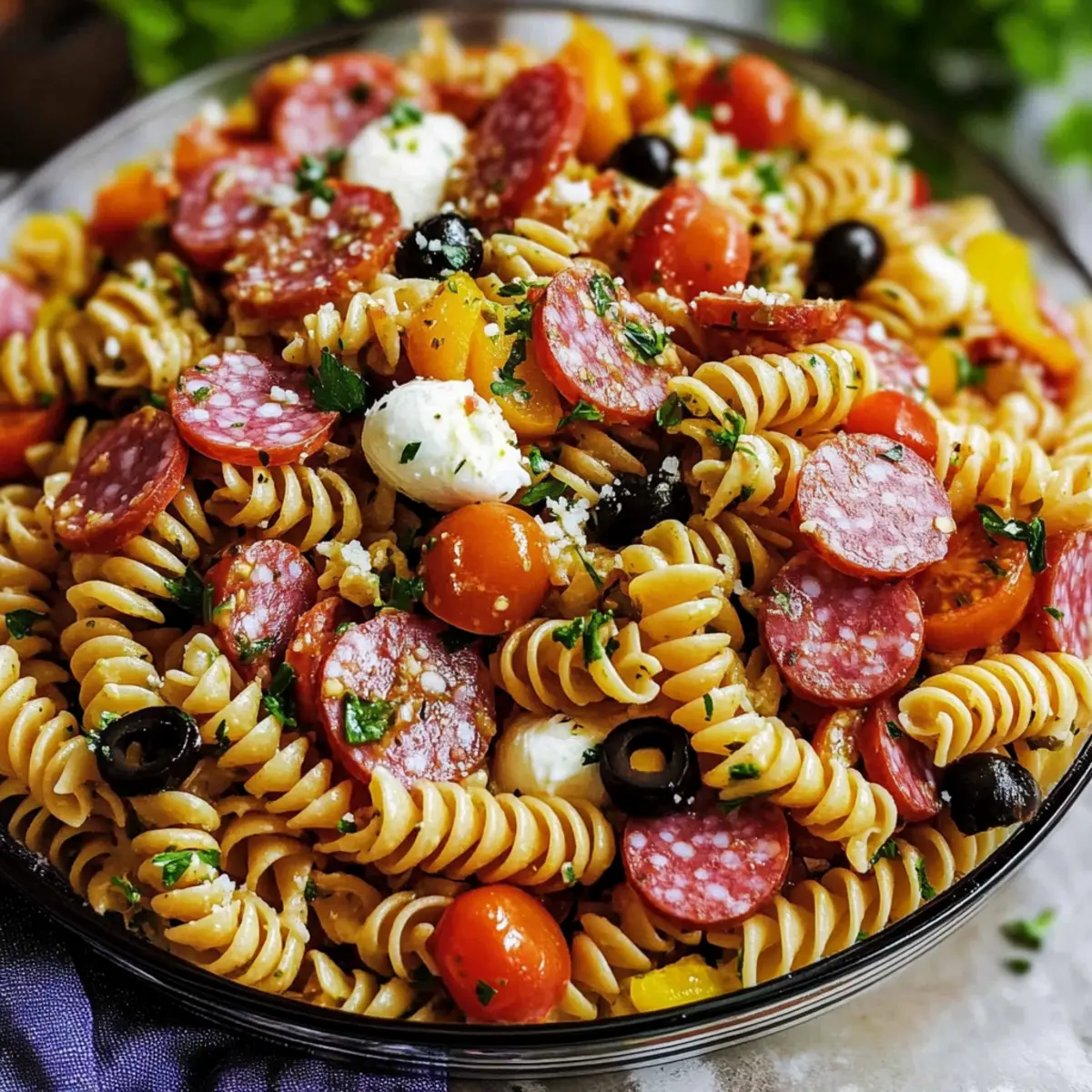 - Fold in 4 ounces each of sliced pepperoni and salami, along with 1 cup of halved cherry tomatoes, ½ cup of black olives, diced orange and green bell peppers, ¼ cup of finely chopped red onion, and a handful of sliced pepperoncini. Stir in 8 ounces of mozzarella pearls.