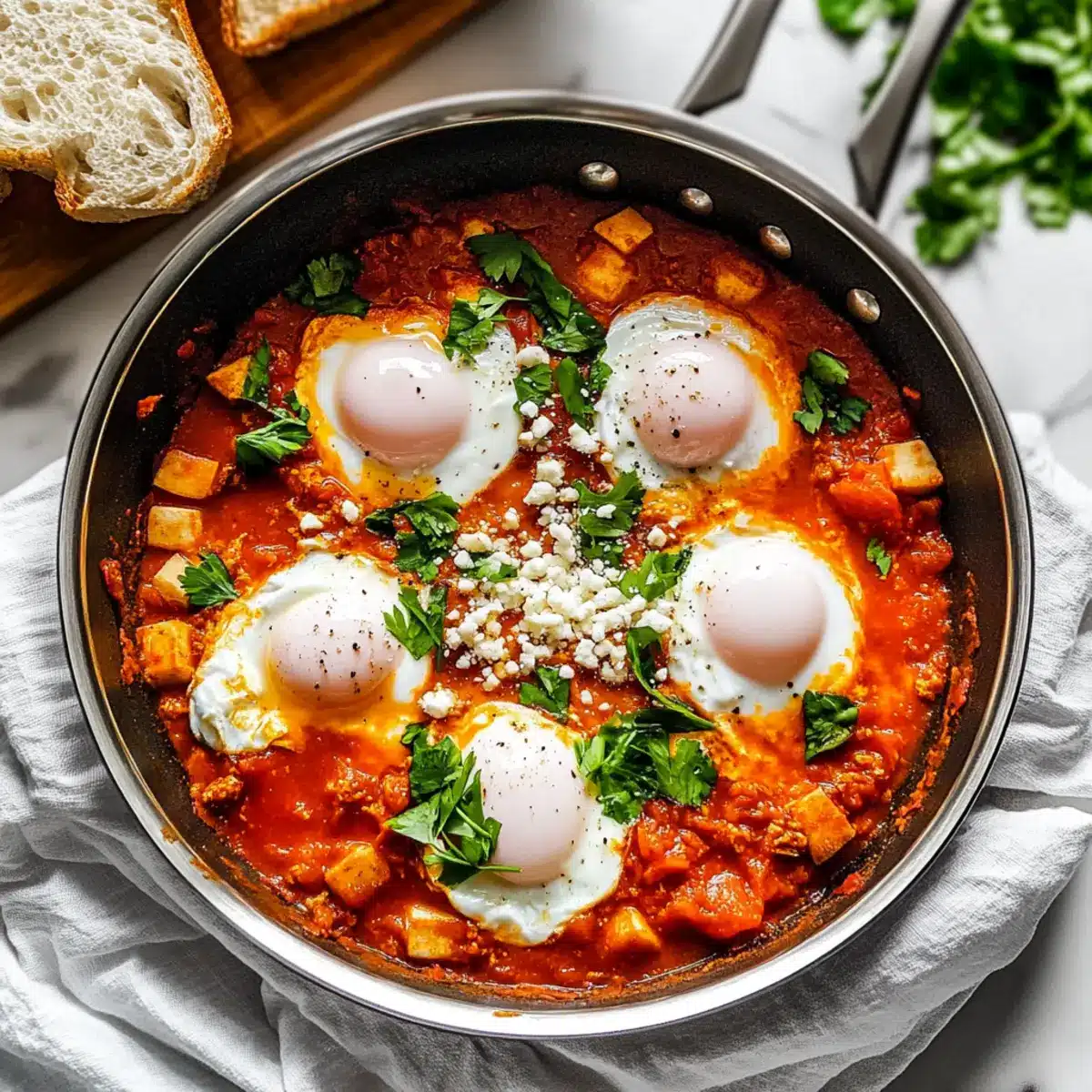 Crack 4 large eggs individually into small bowls. Gently slide each egg into the simmering sauce, evenly spaced apart. Cover the skillet and cook for 5 to 10 minutes. During this time, the egg whites will turn opaque and firmly set while the yolks remain runny—adjust cooking time for your preferred doneness.
