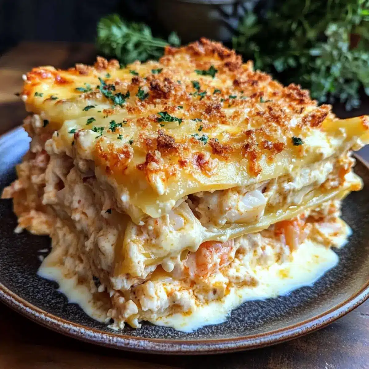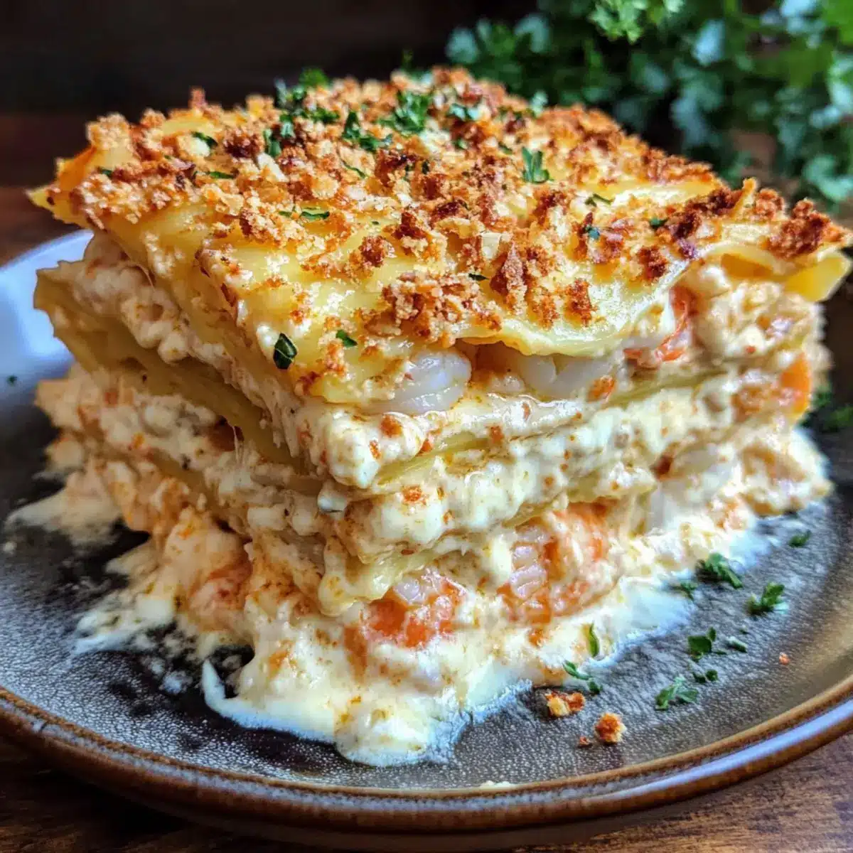 Once baked, allow the Shrimp Crab Lasagna to rest for about 10 minutes before cutting into it. This resting time helps the layers to set, making it easy to serve and ensuring each slice holds its shape beautifully. Garnish with fresh parsley for an extra touch.
