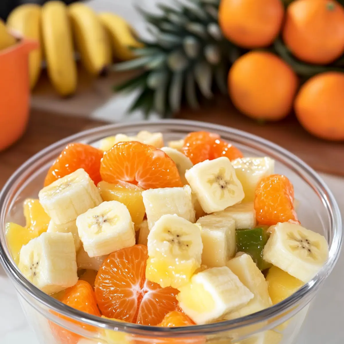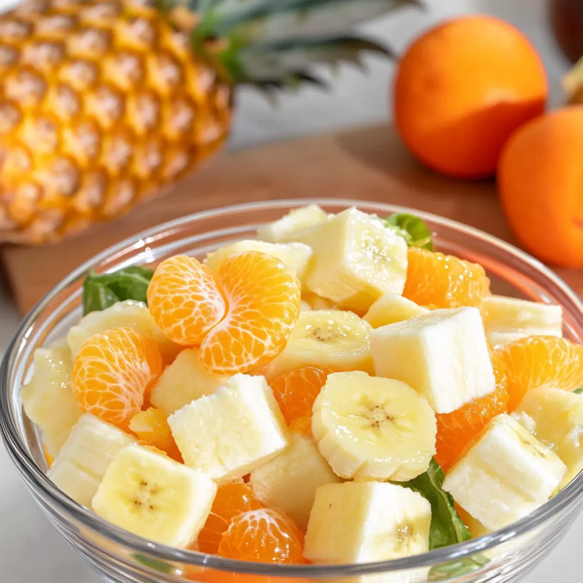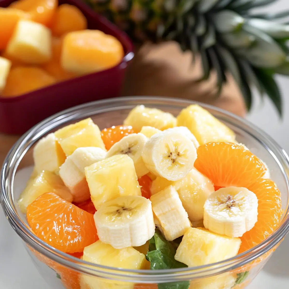 - In a large mixing bowl, gently toss together the pineapple, mandarin oranges, bananas, and mixed greens.